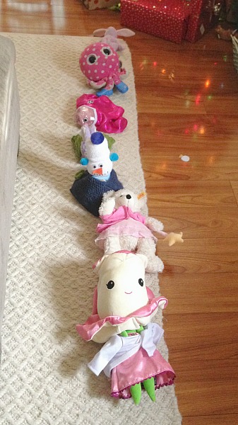 The octopus is named Ollie. The small purple bunny with the skirt on is named Hop. The bunny with boots on is named Purple. The fish with the soccer shirt is named Fishy. The rose with the shirt on is named Rosie. The snowman with the little scarf on is named Icy. The white bear is named Button. I made that necklace for her!